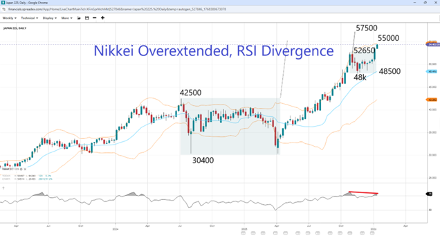 Following the bump to 54,500, which coincides with the upper VWAP, Japan’s 225 index extended deeper into overbought territory while continuing to show bearish divergence on RSI. Notably, the extension to new record highs lies at the measured-move projection target of the 42,500 - 30,400 leg when calculated from the breakout point (42,500). This adds another technical risk factor to the Nikkei’s overextension, making the prior peak of 52,650 all the more important for the sustainability of the uptrend. A break below that level would eye the 50k handle next, with lower support as the middle VWAP of $48,500. Meanwhile, a continuation of the trend will bring into focus the short-term measured-move target of the 52,650 - 48k pullback, seen at around 57,500.