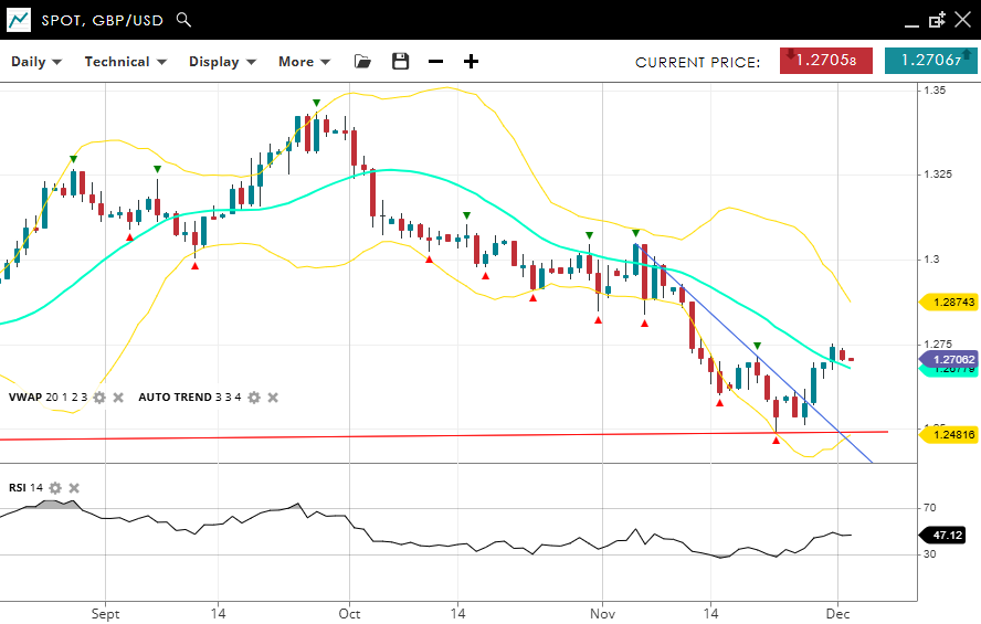 GBP/USD remains bearish but (like EUR) is now in a correction phase, trading at 1.2706, slightly above the VWAP (20) of 1.2677. Support is at 1.2481, with resistance at 1.2874. The RSI at 47 reflects much less bearish momentum, implying a pause in the downtrend.