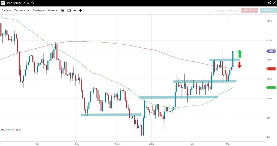 Price is trending higher, possibly playing catch-up to other precious metals, and is now back over the 200 SMA and challenging the July ‘21 peak.