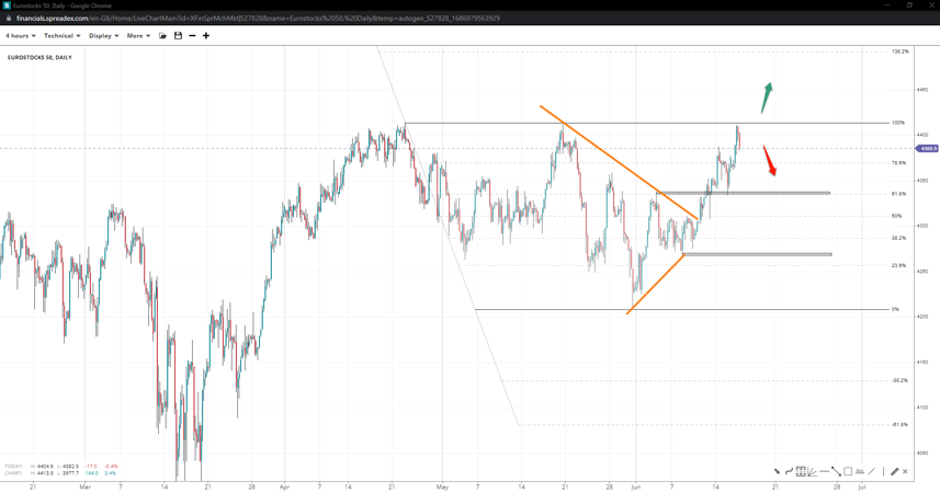US Tech broke outside its ascending channel, entering an accelerated trend towards 16k with an interim resistance by 15500. Losing 15k will increase the chances of a slide towards 14500, but it is unlikely to reach 14220.