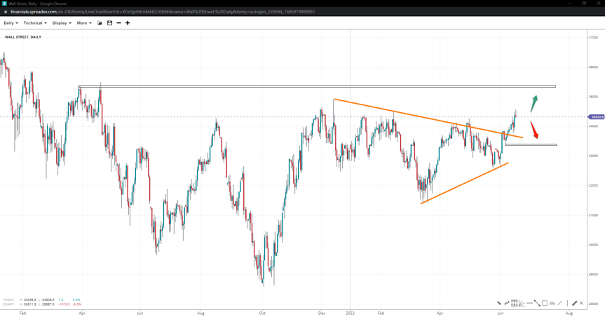 Wall Street resembles a breakout of a rising pennant pattern aiming to reach the top at 35k and perhaps higher, near 35400. If bulls fail to defend the 34k handle in a bearish attempt, the index will be exposed to 33410.