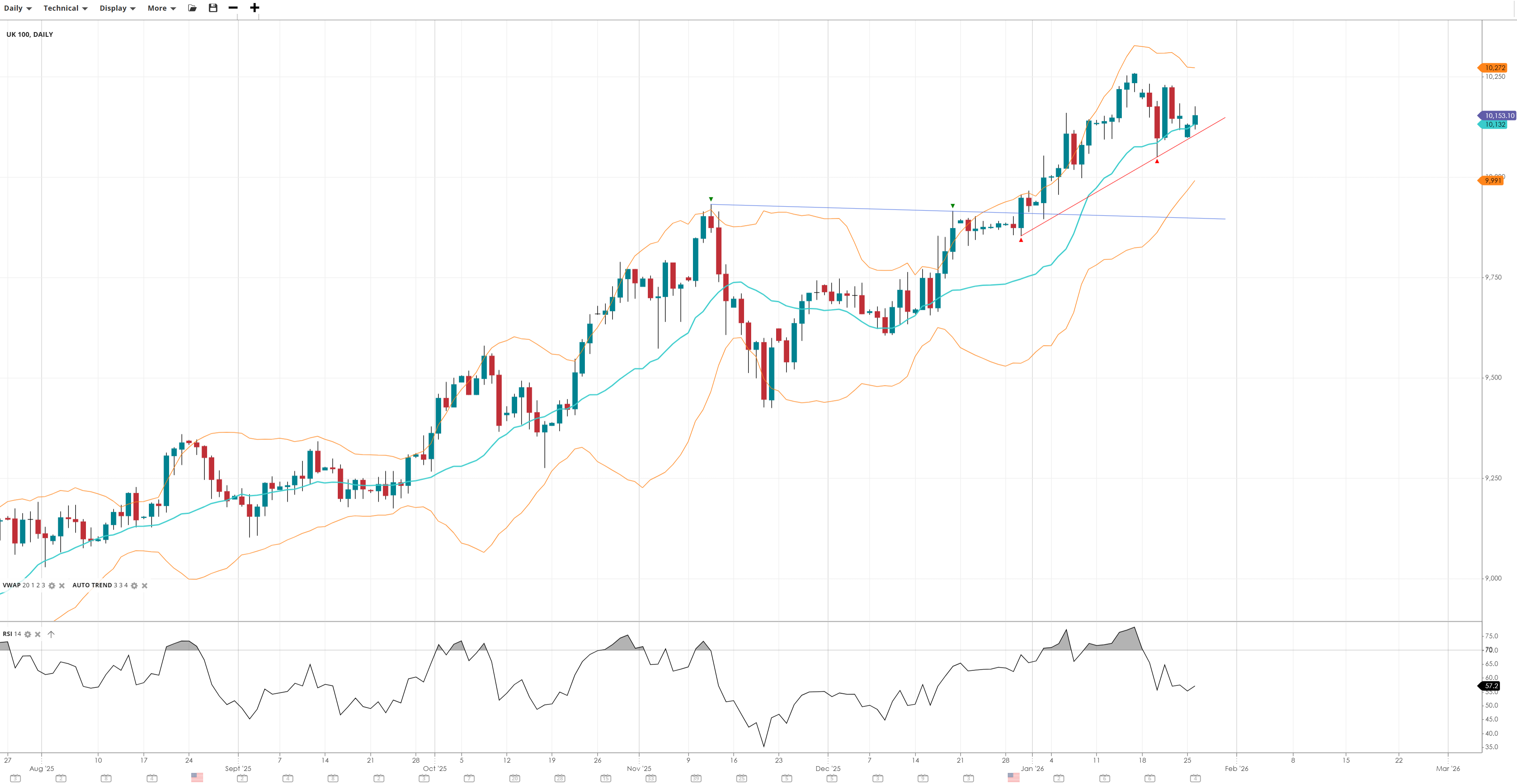 The UK 100 continues its bullish trend, while stuck in a pullback, trading above the VWAP after two dips under. This positioning reflects sustained market strength, with bullish momentum supporting further gains. Support is lower near the 10k threshold, and the record high as resistance.