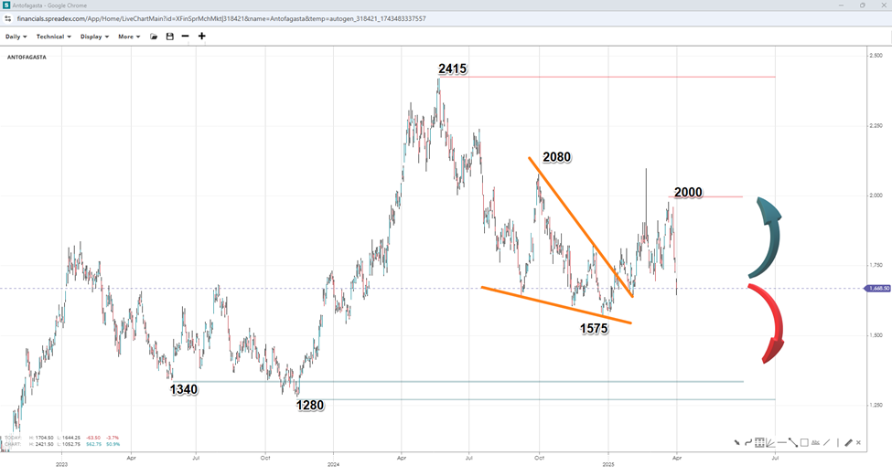 Antofagasta recently formed a descending wedge to 1575, suggesting that if this pullback ends above support levels observed at 1340 and 1280, it might be followed by a move towards 2500 via 2000 and the 2080 peak. If this plays out, the record peak will be in play.