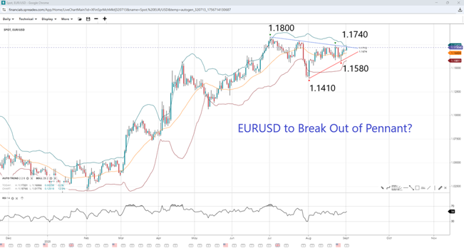 The EURUSD could be forming a bullish pennant as the two 'autorader' trendlines converge and Bollinger bands contract. A breakout would encounter resistance at 1.1740, the high for August, before heading towards the year's high at 1.1800. Support can be found at the near-term swing low if the upper BB holds firm, which coincides with the lower BB at 1.1580, followed by the August low at 1.1410.