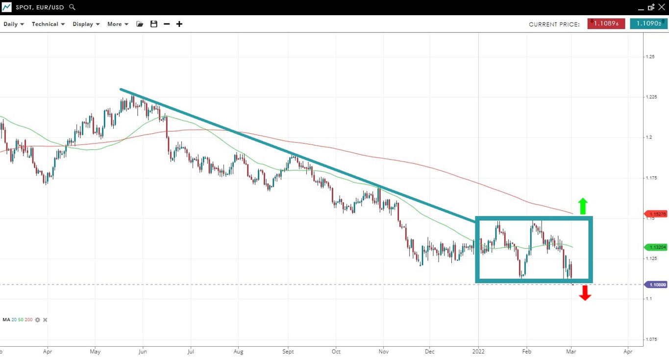 If EU companies keep announcing distancing measures against Russia, the euro will likely weaken further. Even if the situation de-escalates, dovish rhetoric around the ECB could cap any rallies.