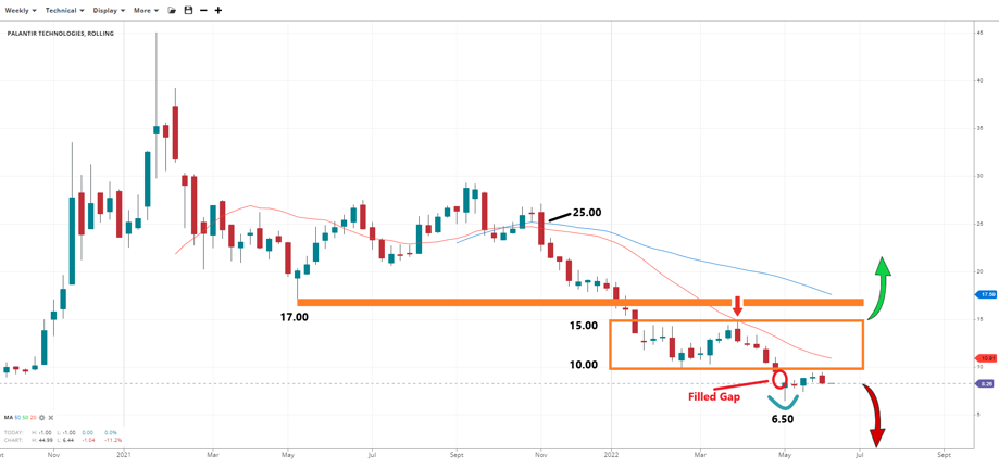 On the contrary, losing the swing low at $6.50 opens up the path to $5.00. These are the prices of the first day of trading for the company, and it's all-time high, respectively.