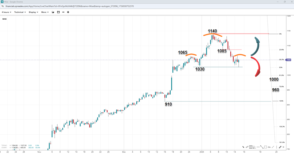 Wise might be forming a bearish head and shoulders pattern, suggesting downside pressure towards the 1000p handle, which coincides with the golden pocket of the last upward leg from 910p to 1140p. The pattern emerged as the stock price fell to form a double bottom, with the neckline around 1030p as crucial support. A decisive break below could trigger a decline towards the 78.6% Fibonacci retracement of 960p, representing a 15% correction from recent highs. However, breaking past the peak of 1065p might invalidate the bearish setup, potentially leading to a retest of the 1085p resistance zone and, eventually, the record peak.