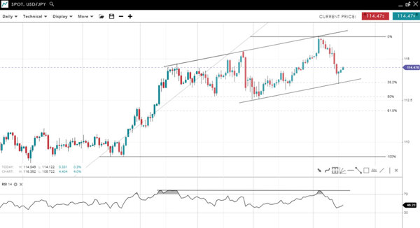 The dollar-yen pair has found support at the 38% Fibonacci retracement of the rally since September as well as parallel channel support, but this is the first decent bounce seen since 116.3. The trend is cautiously higher but a bearish RSI divergence adds to the downside risk.