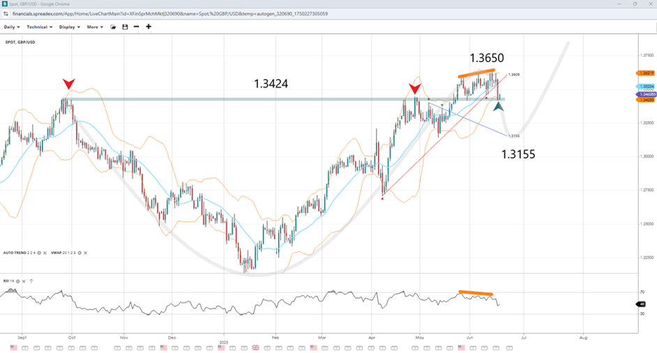 Cable fell to the lower 20-period VWAP at 1.3424 on Tuesday, breaking the ascending ‘autotrend’ trendline following the completion of a terminal wedge pattern. The drop retested the two peaks that formed in September 2024 and April 2025, which might have formed the ‘lip’ of a cup-and-handle pattern in the longer term. A potential bounce could open the door to the middle VWAP at 1.3530 and the ‘autotrend’ projection at 1.3609, with long-term trend projections past 1.40. A hawkish BOE may support prices moving past last week’s peak at 1.3635, exposing the 1.3650 and 1.37 round levels. However, further pressure stemming from an RSI-price divergence could send the pair towards the lower ‘autotrend’ level at 1.3155, contingent on weakness around 1.33 and the subsequent 1.32 psychological support.