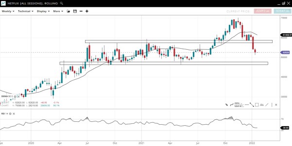 Netflix shares are pulling back within a long-term uptrend (see weekly candlestick chart below). After a sharp decline at the start of the year, it is possible Netflix has already reached a YTD low and is set up for a fresh all-time high. But given the downward momentum, it would be no surprise if markets push shares down once more.
