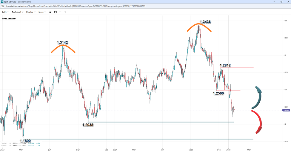 The Cable appears to be forming a bearish head and shoulders pattern, currently approaching the neckline at 1.2038 after the completion of the head at 1.3436. The left shoulder formed near 1.3142, suggesting potential for a right shoulder around similar levels should prices start to bounce from neckline support. Only then may the pattern turn bearish. Holding support could see prices rebound towards 1.2812 should the resistance at 1.2500 provide leeway to bulls. However, a decisive break lower could trigger further downside towards 1.1800.