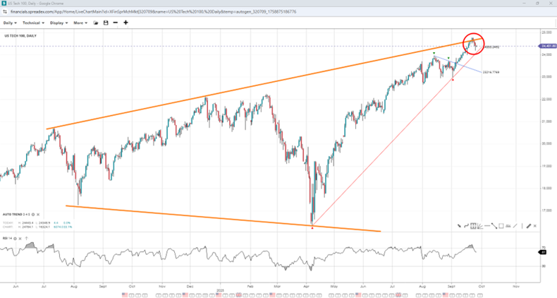 The tech-heavy Nasdaq declined for the third consecutive session to reach a low of 24200 after hitting a record high of 24790 earlier in the week. Notably, the drop came about following a retest of the upper trendline of a long-term open triangle pattern while the RSI entered the overbought territory. If the RSI continues to decline to reset near 50 or the 30 area, Nasdaq could break under the double bottom formation at 24k and even slide towards 23k, where prices formed strong support in early September. Losing this level could be interpreted as a deeper correction by markets, positioning the index near correction territory, 10% below its peak, at approximately 22250. On the other hand, if any of these short-term supports hold firm, the Nasdaq could overtake 25k, with a valid breakout outside the triangle trendline exposing higher levels.