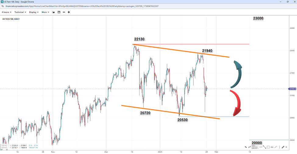 Nasdaq traded near record highs before plunging lower, forming a potential downward channel which suggests further downside in the short term. If the index breaks below the lower trendline support of around 20500, it could exacerbate selling pressure and signal an arbitrary benchmark 10% correction to 20000 from the peak. Conversely, reclaiming the 22130 record might open the door to a 23000 handle, followed by the longer-term 23720 measured-move projection of a potential flag pattern left behind at 20530.