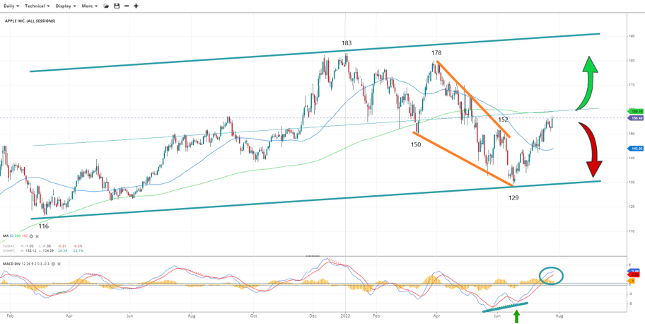 The descending diagonal off the highs of $183 can be seen as both leading or correcting, and the 200-day average will provide further clarity on that.The SMA and the median trendline of the $116/129 – $183 regression channel meet around $160, the most critical near-term level to keep an eye on going up.