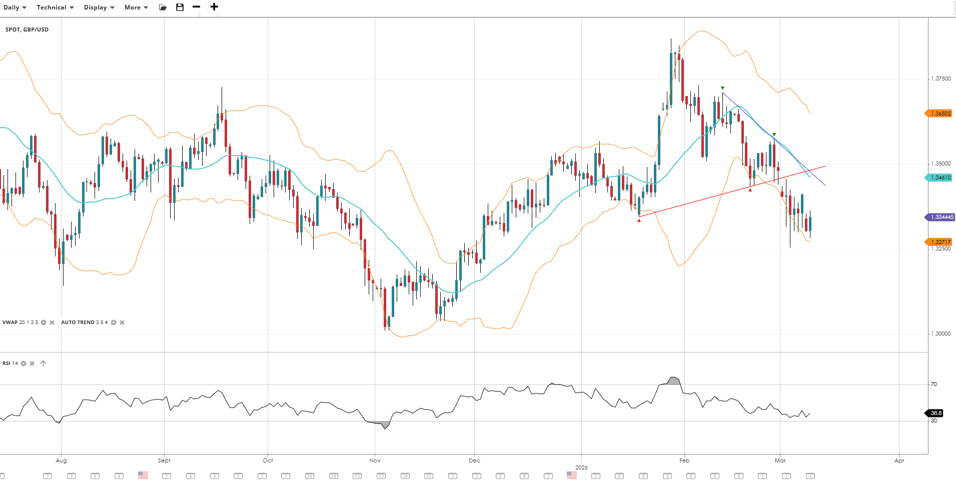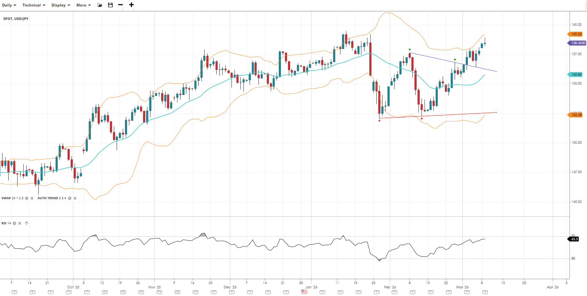 USD/JPY has shifted into a more bullish setup, but still within its sideways range with breaking back above the VWAP but below YTD highs. Momentum is strengthening, with RSI pushing higher as the pair recovers from its February lows and approaches key resistance near the upper standard deviation band.