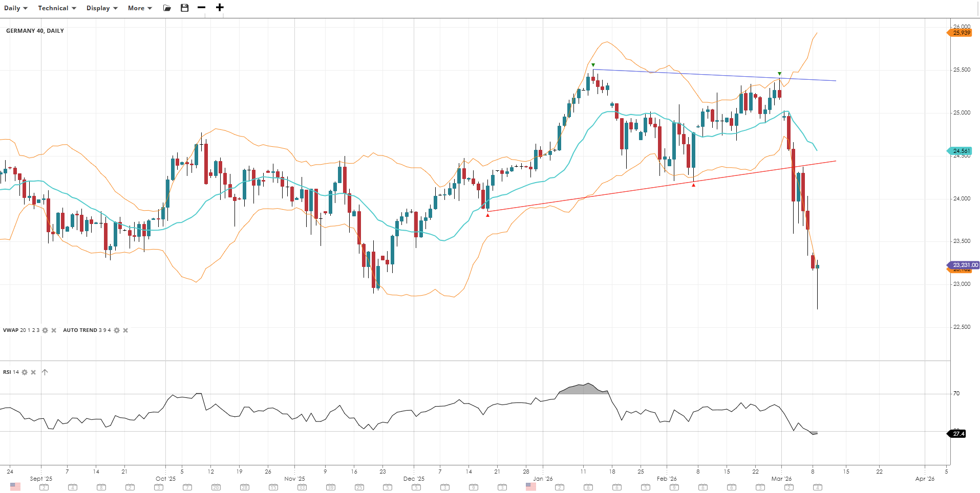 Germany 40 has broken sharply lower in an impulsive bearish move, falling well beneath its VWAP as momentum collapses. RSI has plunged into oversold territory, reflecting the severity of the selloff, with the index now testing multi-month lows near the lower standard deviation band.