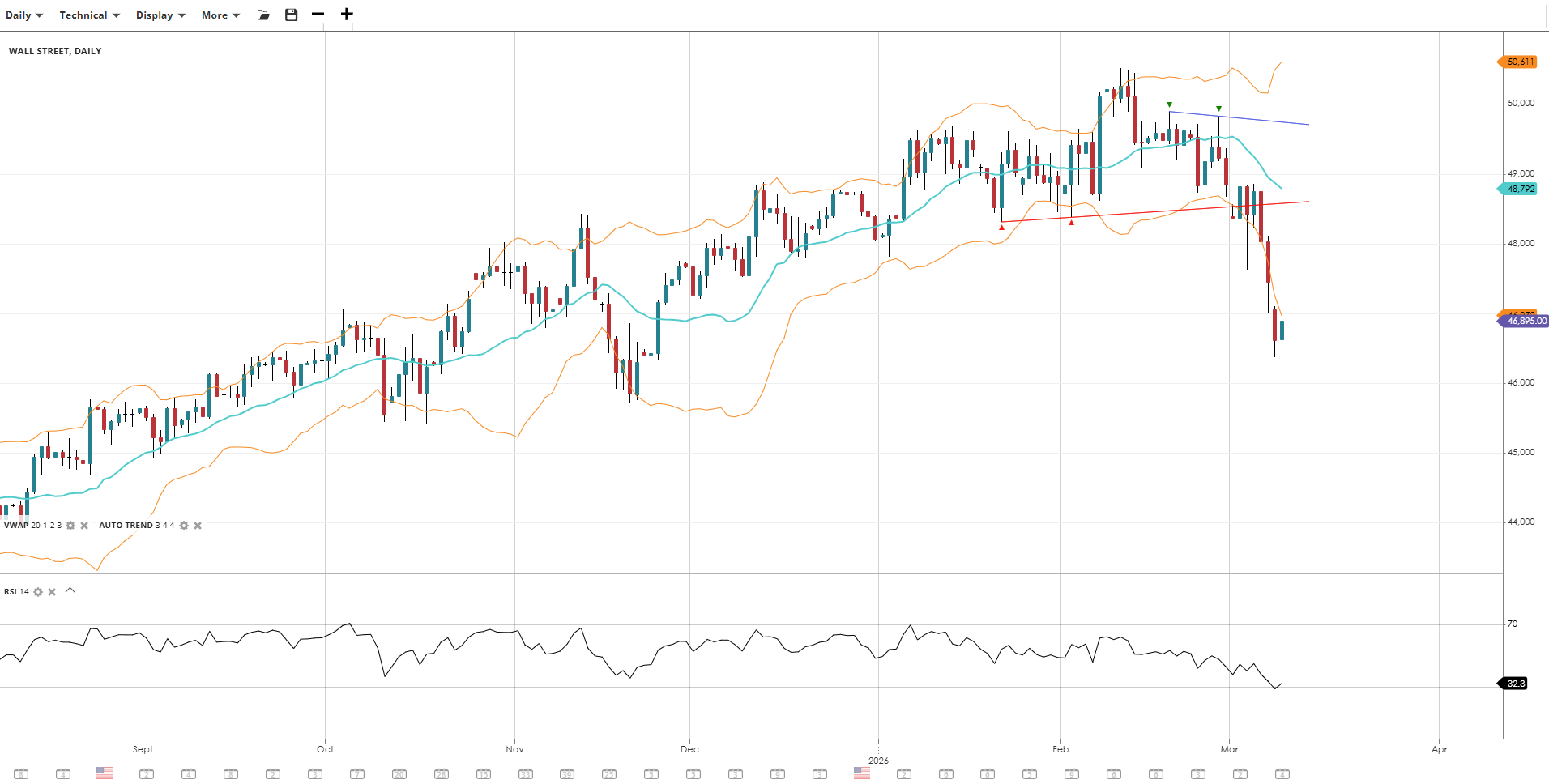 Wall Street has deepened its correction, now trading well below its VWAP as selling pressure accelerates. The trend has turned bearish, with RSI approaching oversold territory and price breaking through key support levels near the lower volatility band.