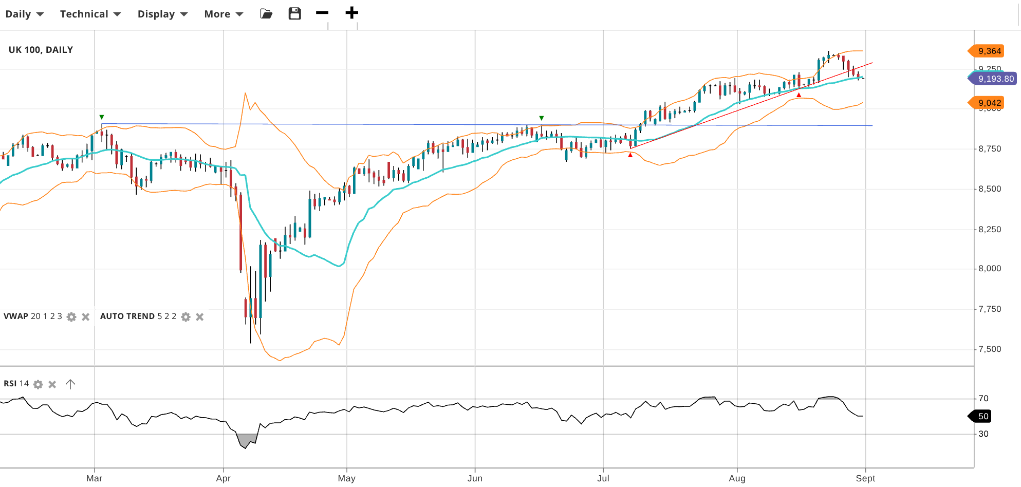 UK 100 remains bullish but has pulled back from record highs down to its VWAP, trading at 9,193. RSI at 50 shows neutral momentum. Support is 9,042, resistance is 9,364.