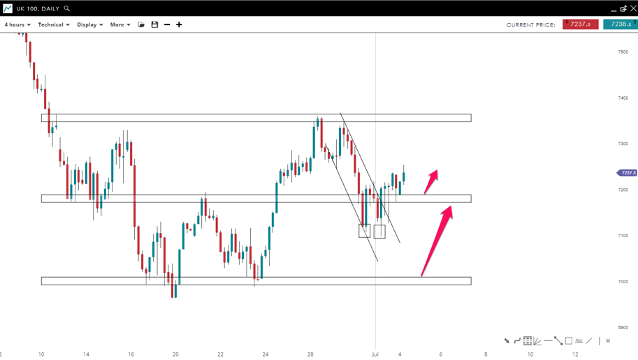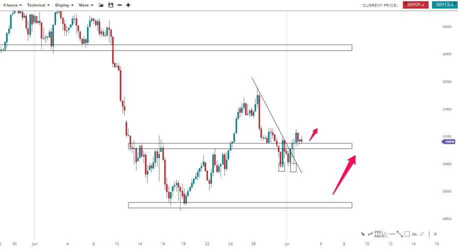 The price of “Wall Street” posted an engulfing bullish pattern on the daily time frame. This shows that the buyers took control of the market and might push it to the upside. On the lower time frame, the asset posted a double bottom which led to a break of the bearish trend line to the upside. A lower correction could be seen to the 30,800 mark before a new bullish impulsive wave toward 32,625 level, the lows from early June.