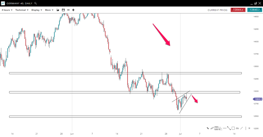 The price of GER40 was in a clear downtrend before entering into a sideways movement with a floor of 13,000. Sellers managed to break this parallel channel to the downside, and now the price is being traded inside a bearish wedge formation. If the bears succeed to break this pattern to the downside, then a further downward movement could be seen toward the 12,500 mark.