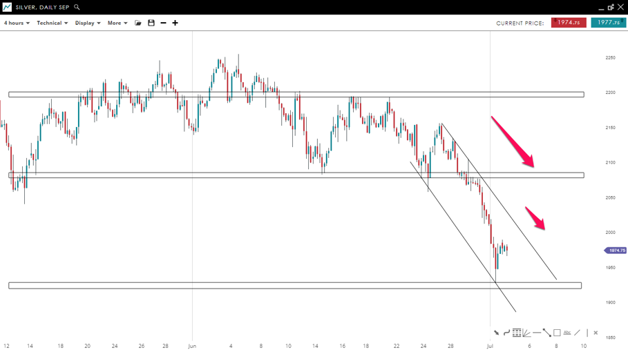 The price of “Silver” is moving to the downside where lower highs and lows have been posted. In addition, the asset is traded inside a bearish channel formation. The market reacted to a strong support level near the 1,920 mark. A higher correction toward the higher end of the channel could be seen before a new bearish impulsive wave that could push the price back to the 1,920 mark.