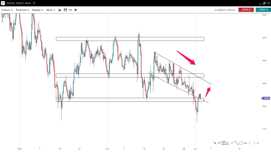 Gold has re-entered inside its prior sideways range after a fakeout to the downside near the strong support level (1,800). This shows that the bears are weak and the buyers could be about to reverse the price to the upside. If this scenario occurs, we could see the yellow metal reaching the area of confluence made by the higher end of the channel and the next key resistance level around the 1,875 mark.