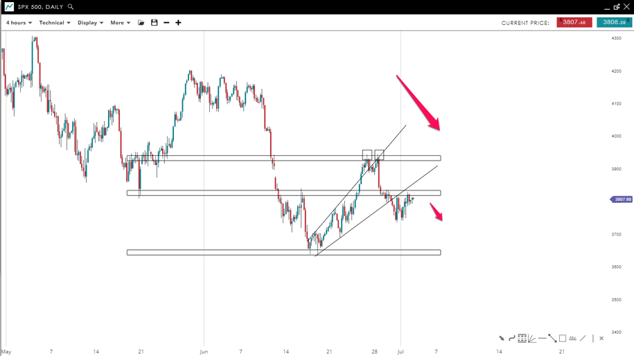 Sellers are in clear control of the market where lower lows and highs have been posted. We have seen a strong upwards correction in the form of a rising wedge pattern. A double top has been left just above 3900, which led to a reversal and a move lower. In addition, the price managed to break the wedge pattern to the downside which is a sign of strength from the sellers. Further movement to the downside could be seen toward the 3,645 mark.
