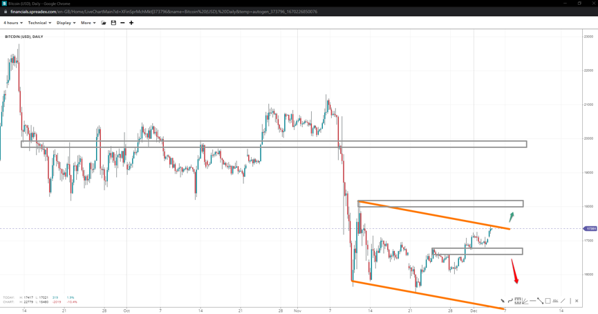 Bitcoin appears to receive rejection at the top channel trendline with a probable reversal back to the opposite side. 16750 is short-term support bears need recapturing for a chance at 16k and the low of 15480. A break above the upper trendline could send prices to 18150, with increased momentum extending its potential to the 20k handle.