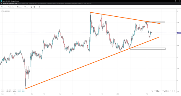 The prices of GBP/ZAR have been trading within a pennant pattern, either complete or likely to complete fairly soon. A short-term decline to the lower trendline must be followed by a reversal upwards for the pennant pattern to complete. Otherwise, the pair could succumb towards 20.00, with a stop by 20.40. Control of the 21.00 round resistance is critical to the bulls’ work, along with the ceiling at 21.50.