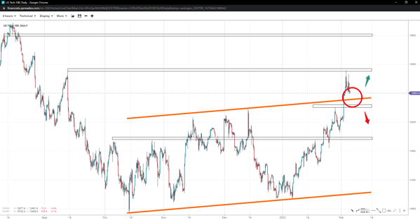 The US TECH index breached the upper channel trendline to recapture the 12880 resistance and is now correcting towards 12250. If the trendline offers a retest, bulls could revisit the peak and break past the 13k handle for a chance at 13500. Breaking through the trendline could see the 12k lost and the door to 11700 wide open.