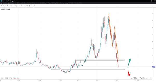 The price of Natural Gas appears in a dead-cat-bounce pattern with an extended breakout leg exceeding the length of the initial downward move significantly at $3.5. The next major support lies at $2, with a reversal or some respite at least likely. Below $3.5, it is unlikely the commodity exits the bear market.