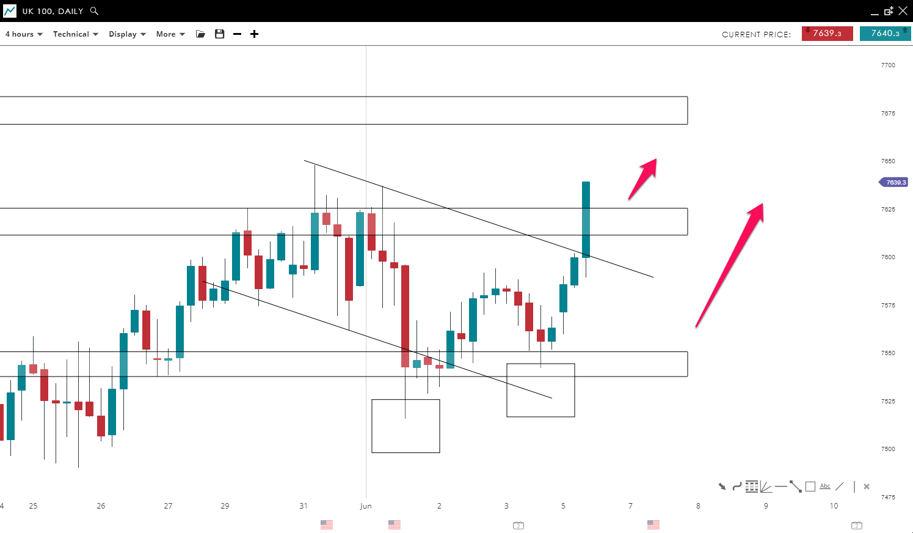 The bulls showed strength by pushing the price higher since the end of May. The index breached the bullish flag to the upside after posting a higher low on June 4. If the current 4-hour bar closes above the 7,625 mark, this could lead to a further move to the upside toward the 7,680 level.