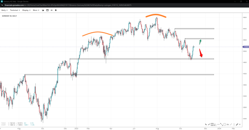 A head-and-shoulders pattern may be brewing in Germany’s 40 index following a bounce at the double-bottom support at 14580. Failing to get through 15580 will increase the chances of panning out, whereas a move past will likely invalidate it and head towards the next resistance at 16K. A successful rejection would imply further drops towards 14K.