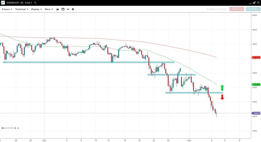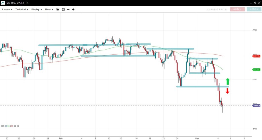 Price has hit new YTD lows after taking out support from the Feb 28 low and has since dropped well under psychological support from the 7000 level.