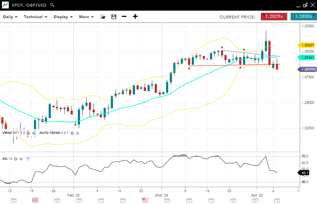 GBP/USD has tilted into consolidation mode after a sharp weekly reversal that could lead to full trend reversal, now trading at 1.283, just below its 20-day VWAP of 1.2945. The RSI of 45.1 reflects waning momentum. Key support is located at 1.2829, and resistance stands at 1.3066 to revive the bullish tone.