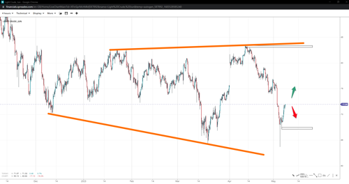 Having taken the previous support at 64.30 out, WTI appears to be under an open triangle formation, with a potential target above 83.40. If prices retreat below 67.5 again, the bearish trend may continue towards the 60 handle, while a move past 74 could signal further gains towards 77 and eventually complete the triangle higher.