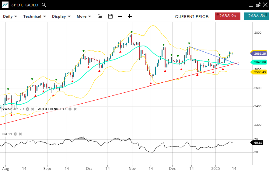 Gold is looking more bullish but holds a neutral stance for now, trading at 2,686, pushing above the VWAP (20) of 2,640 and into the upper band. Support and resistance are at 2,586 and 2,690, respectively. An RSI of 60 highlights the slightly bullish momentum, in line with the price action.
