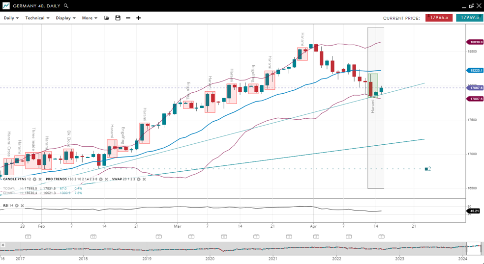 Germany 40 is exhibiting a corrective phase within an overall bullish trend, with the price now standing at 17,966, which is slightly below the VWAP of 18,223. The index has found new support at 17,807 and is encountering resistance at 18,638. The RSI is at 45, indicating a cooling off of the previous bullish momentum.