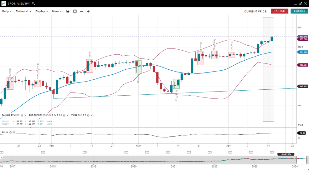USD/JPY continues in a bullish trend and remains impulsive, with the price slightly up at 153.84, above the VWAP of 151.86. The support level is 150.20, with resistance observed at 153.52. The RSI at 76 shows a modest decline in bullish momentum.