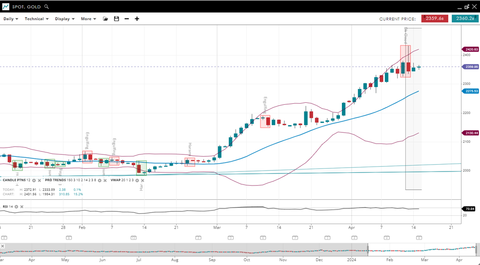Gold has sustained its bullish trend and is in an impulsive phase, with a price hike to 2,359, well over the VWAP of 2,275. The support level has been marked down to 2,130, and resistance has been found at 2,420. The RSI has risen to 70, suggesting a stronger bullish sentiment and an overbought condition.