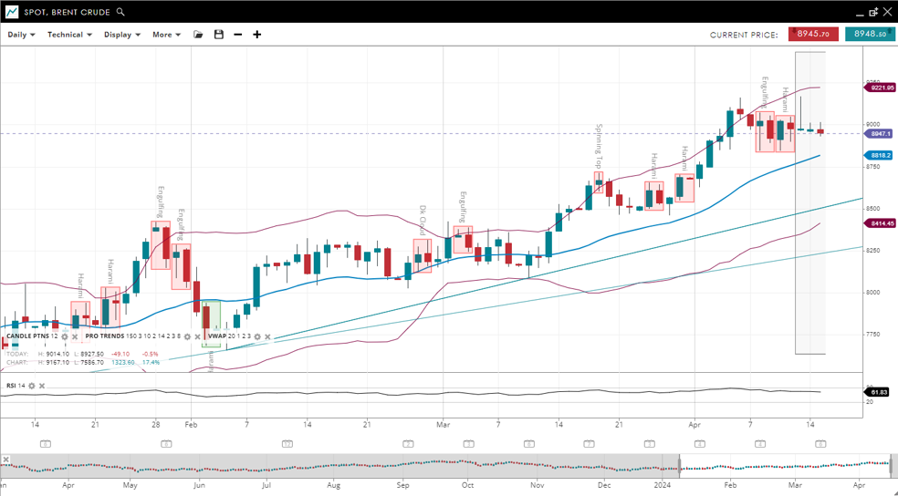 Brent Crude remains in a bullish and impulsive phase, with the price now at 89.47, above the VWAP of 88.18. Support has been established at 84.14, with resistance not far off at 92.21. An RSI of 61 indicates a marginal decrease in bullish momentum.