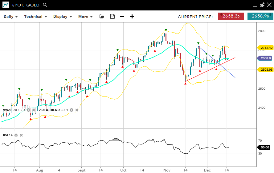 Gold remains neutral in a consolidation phase with little change over the past week, trading at 2,658, near the VWAP (20) of 2,650. Support is set at 2,598, with resistance at 2,713. The RSI at 50 reflects balanced momentum, signaling indecisiveness in the market.
