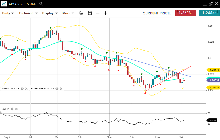 GBP/USD is in a bearish correction phase, trading at 1.2653, back below the VWAP (20) of 1.2670 but inside horizontal VWAP bands. Support is at 1.2543, and resistance is at 1.2817. The RSI at 43 suggests mild bearish momentum, with potential for further downside.