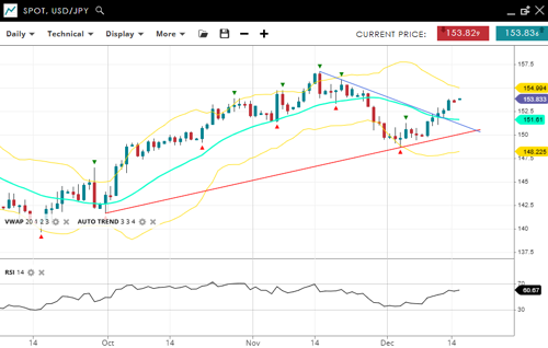 USD/JPY is bullish in a correction phase, trading at 153.83, now back above the VWAP (20) of 151.61 in what could be a sign the uptrend is resuming. Support is at 148.22, and resistance is at 154.99. The RSI at 60 reflects strong upward momentum, suggesting further gains are likely.