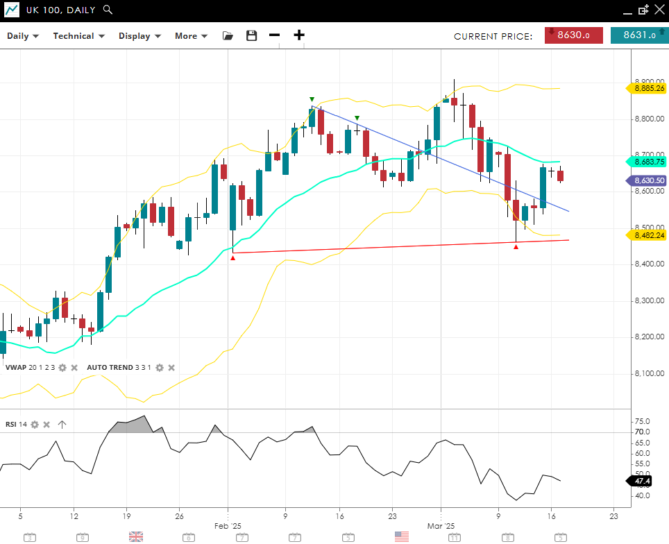 The UK 100 retains an overall bullish trend but has moved into a corrective posture, trading at 8 631 just below its 20‐day VWAP of 8 684. Momentum has softened, as suggested by the RSI reading of 47. Key support sits at 8 482, while 8 885 serves as the next major barrier against a renewed climb.