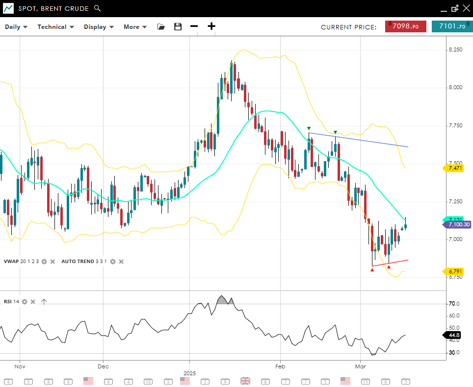 Brent Crude stays locked in a bearish, impulsive swing, currently at 7 100—still beneath its 20‐day VWAP of 7 230. The RSI of 45 reveals ongoing selling pressure, though not at an extreme. Sellers will be eyeing a break below 6 791 support to drive the next leg down, while 7 471 stands as a hurdle to further recovery.