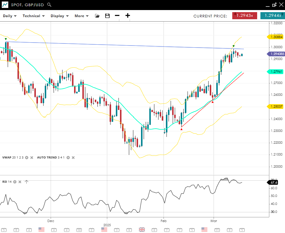 GBP/USD persists in its bullish ascent at 1.2940, reinforcing an impulsive stance above the 20‐day VWAP of 1.2791. Momentum remains elevated (RSI 68), edging closer to overbought but not quite there yet. Support around 1.2504 underpins any corrective slide, while 1.3088 may attract buyers if the rally continues.