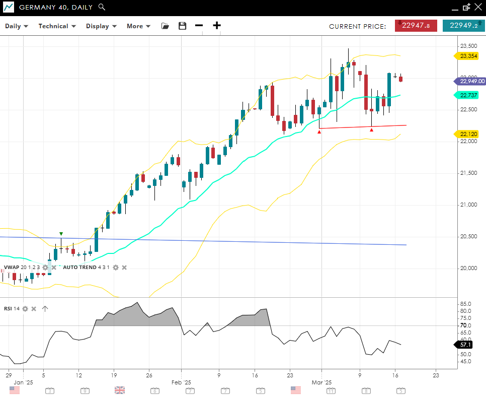 Germany 40 maintains a bullish trajectory, with price action at 22 949 firmly above its 20‐day VWAP of 22 737—indicating an impulsive upswing. The RSI at 57 points to moderate upward momentum, while support at 22 120 could cushion any pullbacks. Resistance is located at 23 354, where a decisive break may open further upside.
