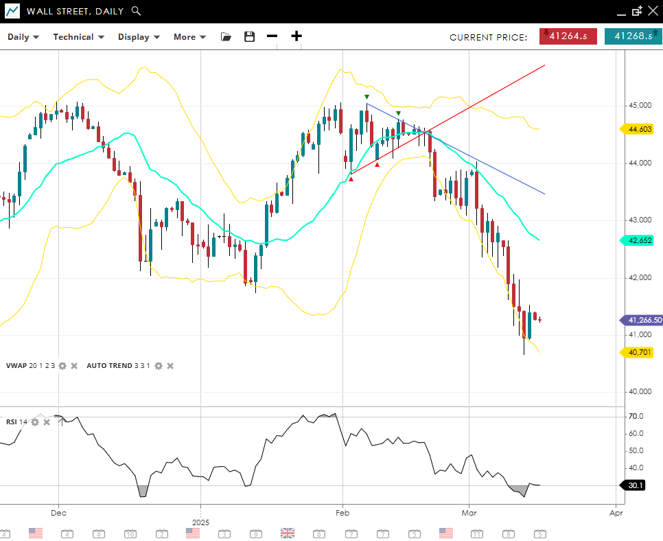 Wall Street extends its bearish momentum, posting 41 268 and remaining well under the 20‐day VWAP of 42 652. With an RSI of 30, prices are creeping toward oversold territory, signaling persistent downside pressure. Support is noted at 40 701, and any recovery attempt would first target 44 603 as immediate resistance.