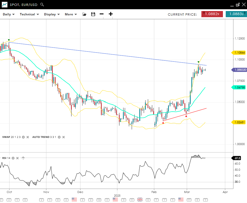 EUR/USD continues its upward march, standing at 1.0883 in an impulsive move that surpasses the 20‐day VWAP of 1.0676. With an RSI reading of 70, the pair flirts with overbought conditions, yet strength remains evident. Should prices pull back, 1.0255 is the safety net, whereas 1.1086 is the next notable ceiling for potential gains.
